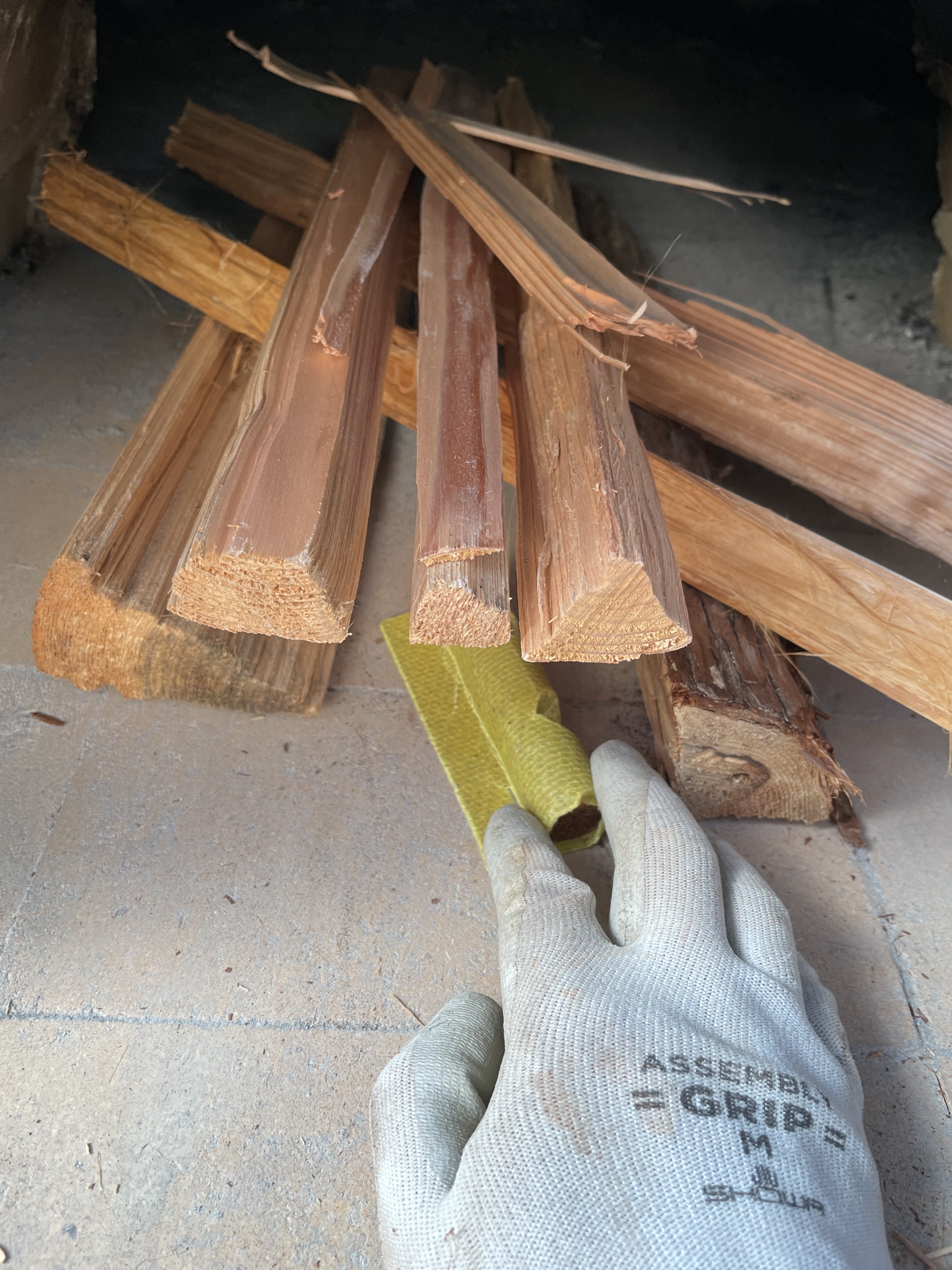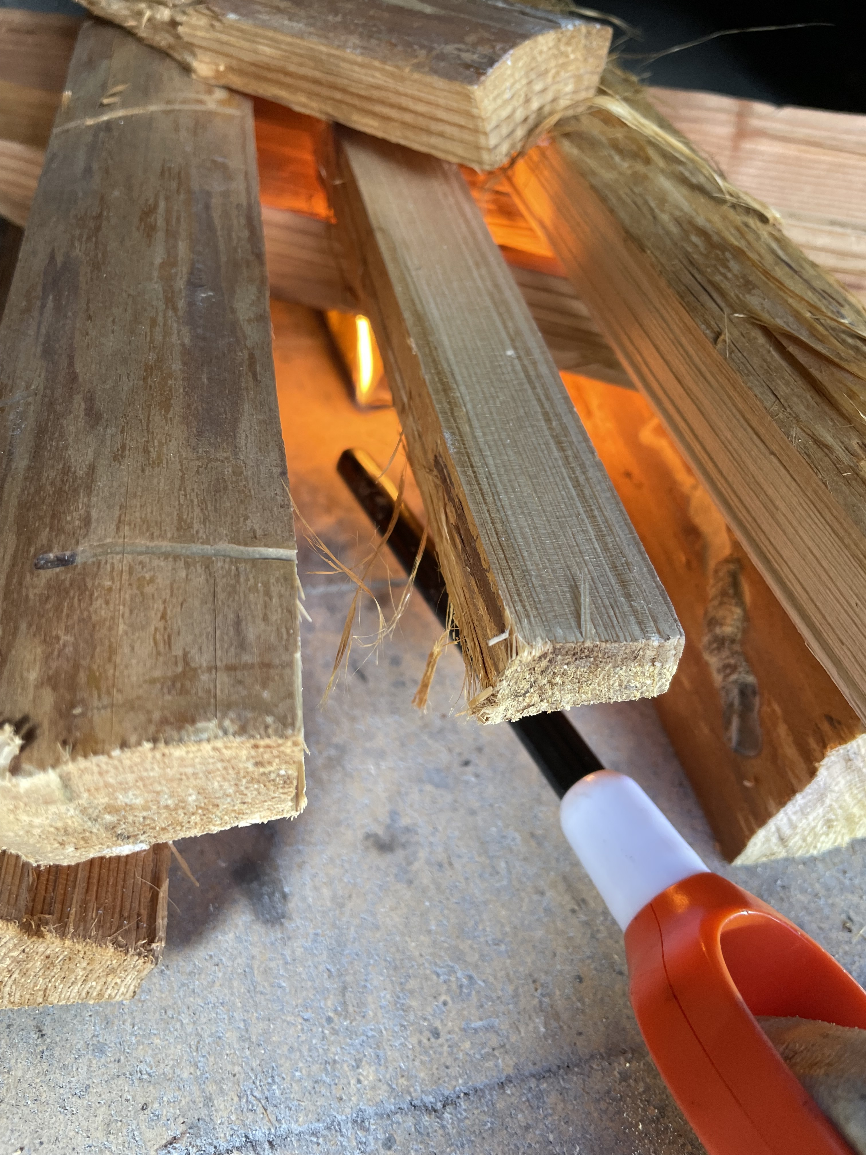 こんな感じで焚き付けを組んで着火剤を下にいれます。