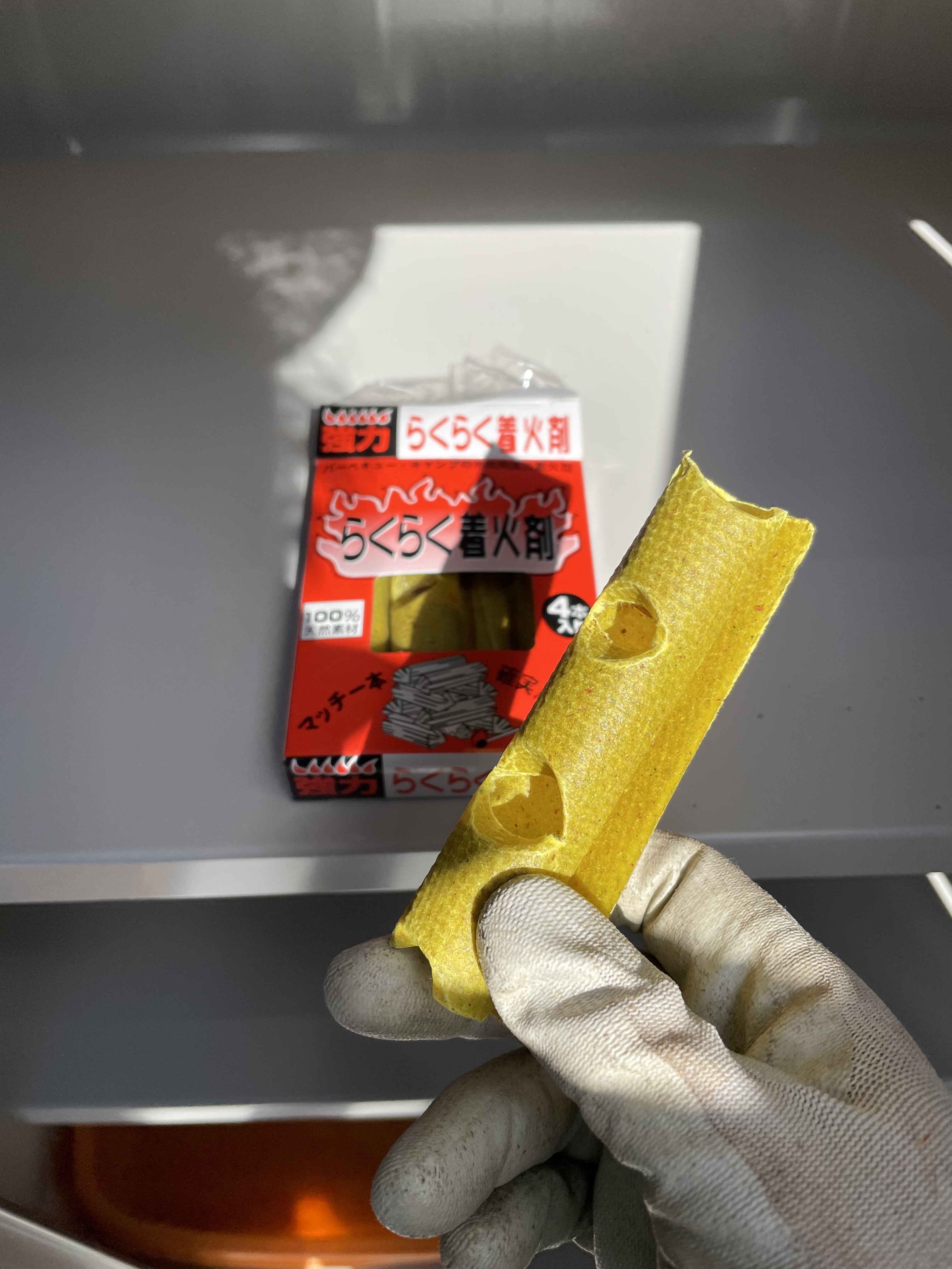 物置にあるチヤッカマンで着火剤に火を付けましょう。
